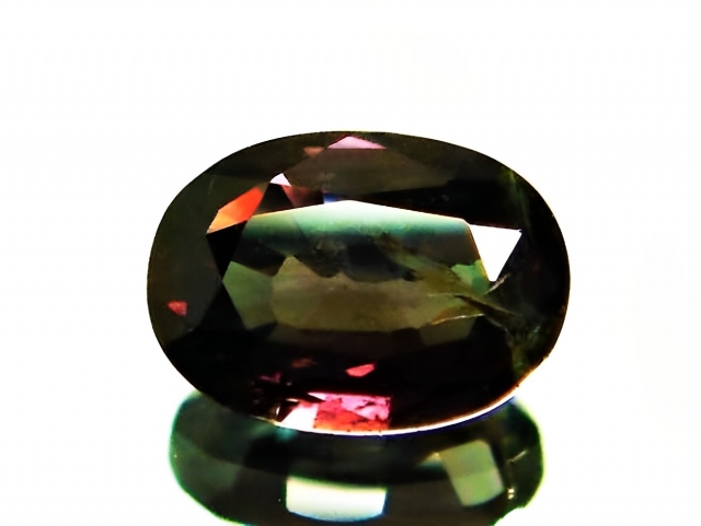 カラーチェンジする宝石の一種であり、太陽光の下ではグリーン、白熱光の下ではレッドを示します。