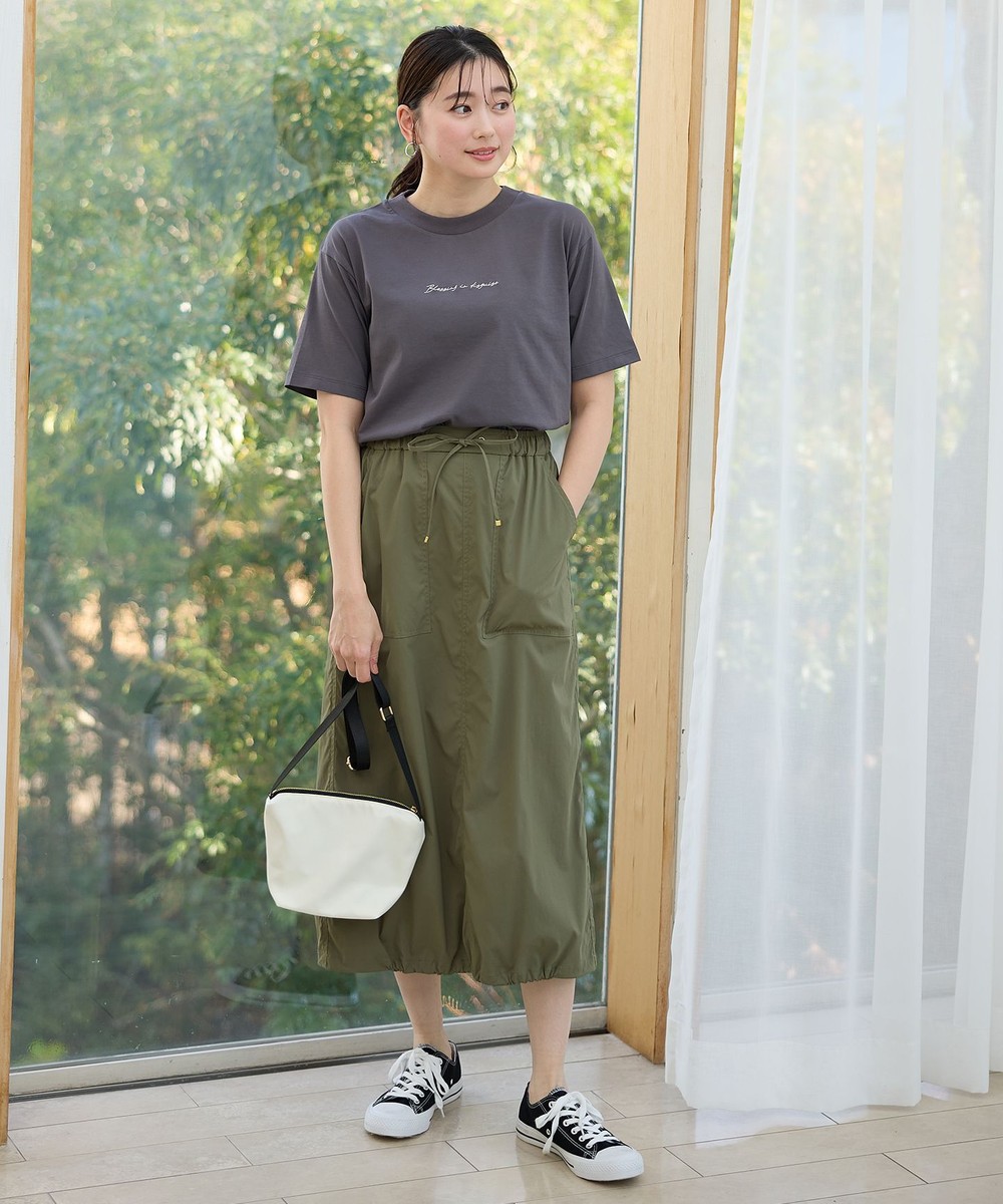 こなれ感抜群のベイカースカートは、裾にはドロスト(※)が入っているので裾を絞ってバルーン風シルエットの変化を楽しめます。カジュアルからキレイ目までどんなトップスとも好相性!