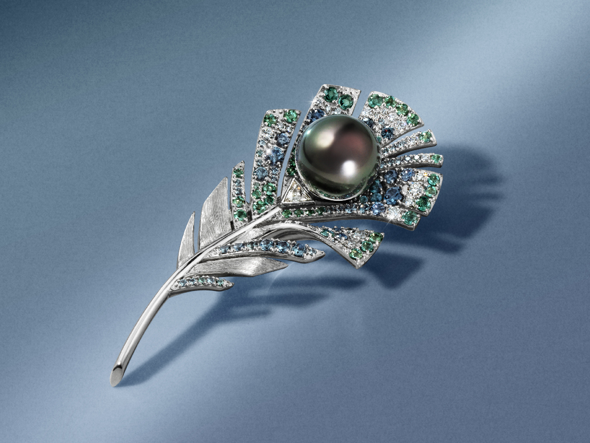 黒蝶真珠とアレキサンドライトやベキリーブルーガーネットといったカラーチェンジストーン(※光源によって色が変化する宝石)に、職人が手作業で彫りを施したテクスチャーを重ね、繊細な光沢のコントラストを描きます。