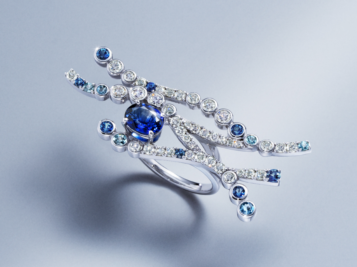 「明石の君」を表現したプレミアムジュエリー「セラヴェル」は、彼女の持つ穏やかな気品と安らぎを、さざ波をモチーフに表現したリング。古典で見られる水紋表現・流水紋を参照しながら、主体石にはブルーサファイアを用い、石留め技法や高低差など繊細なつくりにこだわりました。